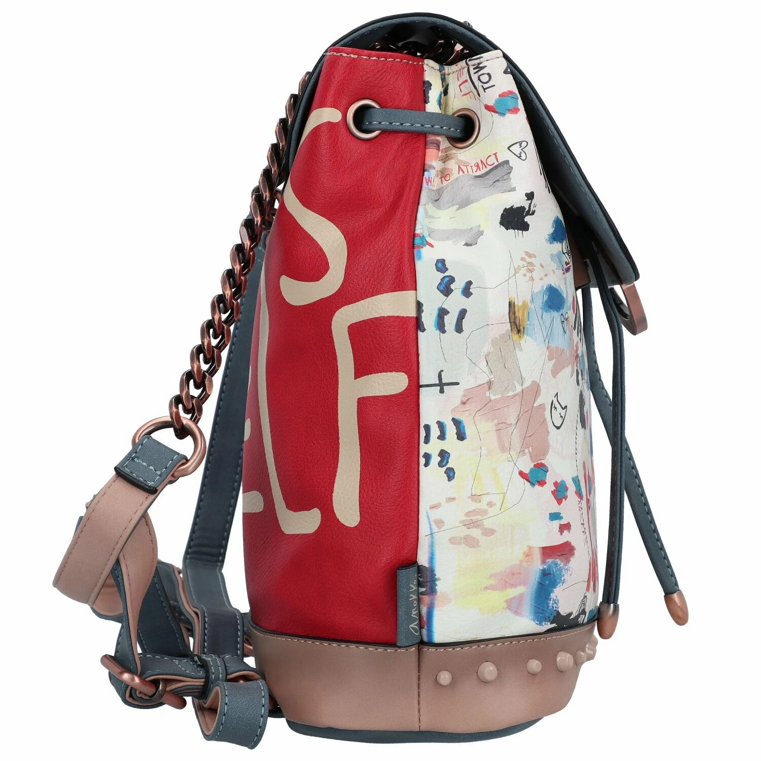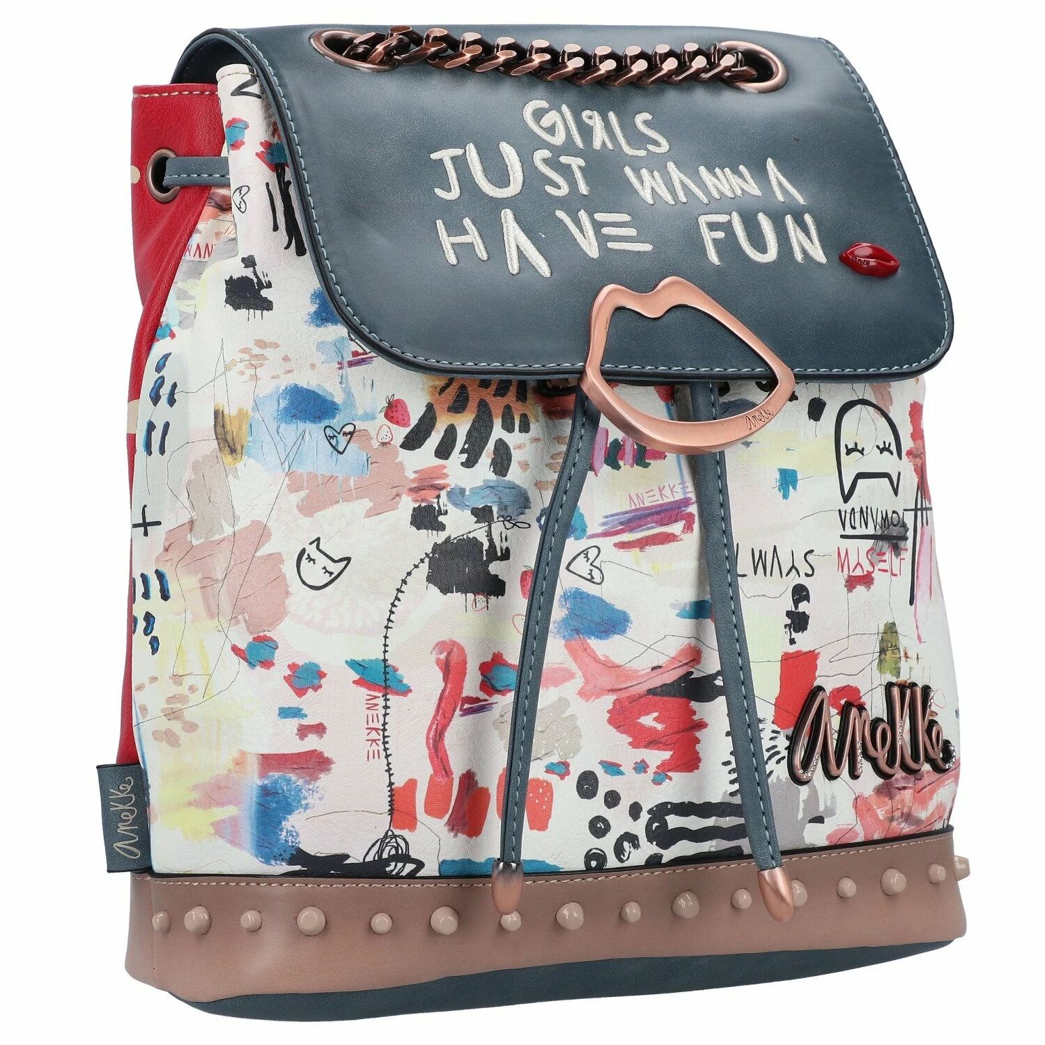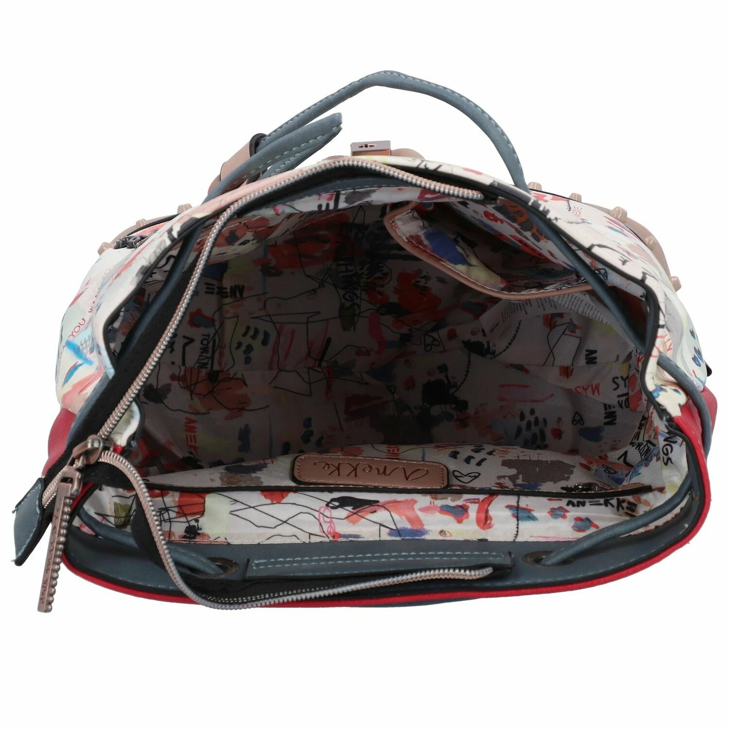 Schöner City Rucksack von Anekke mit auffälligem Muster. Im Inneren des drei Hauptfächers befindet sich ein Reißverschluss- sowie Handy- und Steckfächer. Der Rucksack besticht durch seine Form und Funktionalität. Der praktische und gleichzeitig stylische Begleiter fürs City.