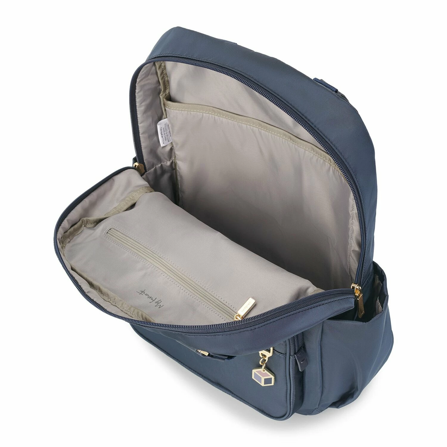 Funktioneler Businessrucksack für Damen aus strapazierfähigem, wasserabweisendem Material mit Akzenten aus echtem Leder. Der Rucksack bietet alles, was Sie brauchen, um organisiert zu bleiben – viel Platz im Hauptfach und die Nebenfächer für Wertsachen, Handy, Unterlagen, Stifte und anderes, sowie ein gepolstertes Laptopfach für Laptop mit Bildschirmdiagonale bis ca. 33 cm (13 Zoll). Zudem verfügt er über eine Trolley-Lasche auf der Rückseite zur Befestigung an einem Trolleygestänge. Der perfekte Begleiter in Beruf, Reisen und Alltag.