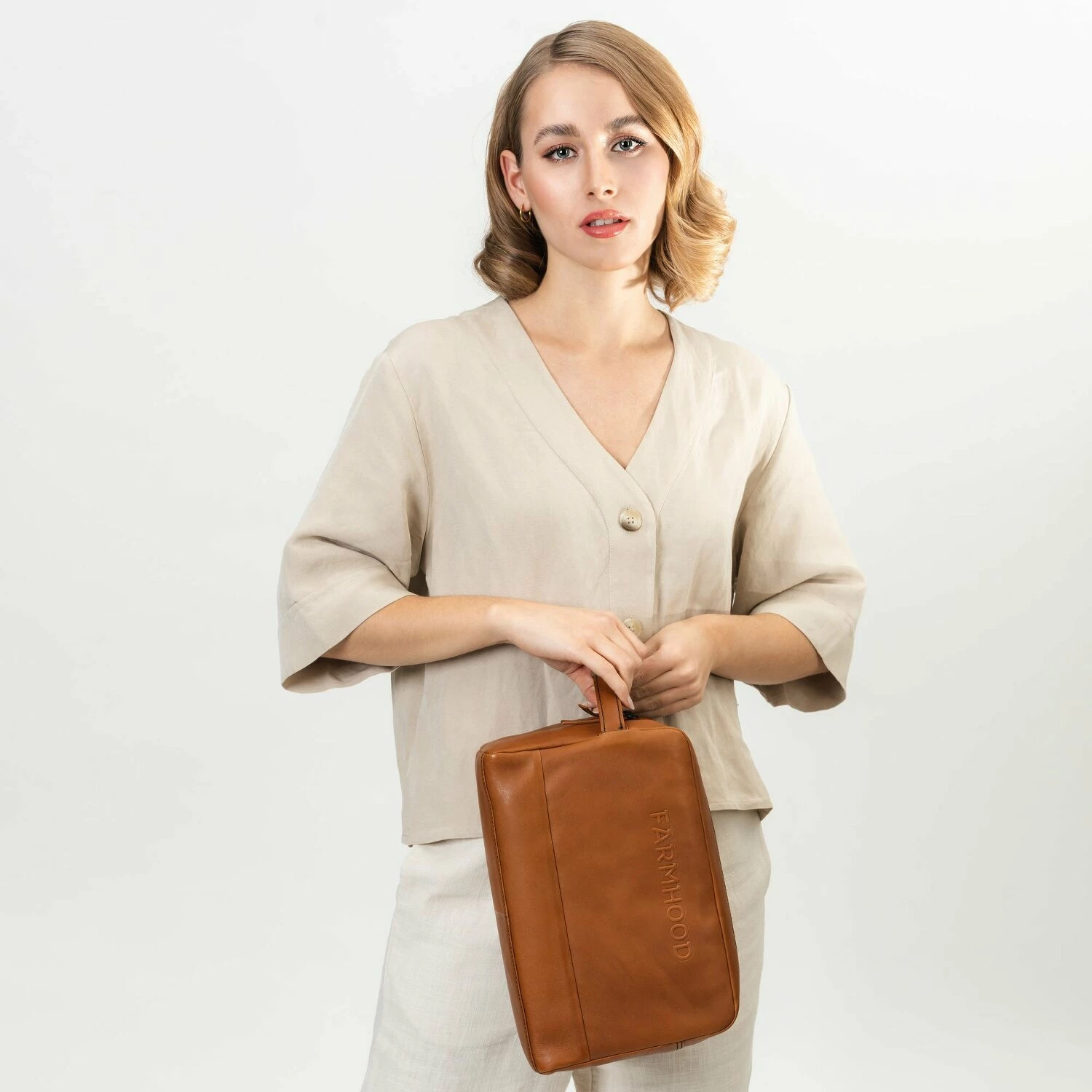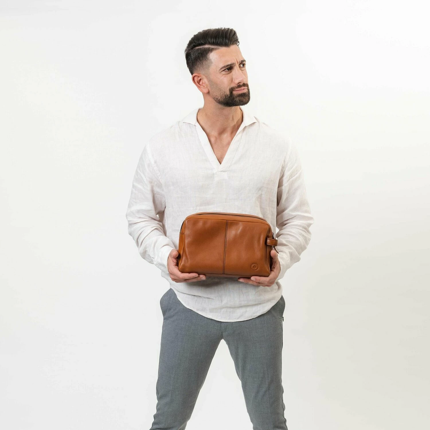 Wertiger Kulturbeutel von Farmhood aus Leder mit einem Reißverschlussfach im Inneren. Zwei Hauptfächer sorgen für viel Stauraummöglichkeiten.