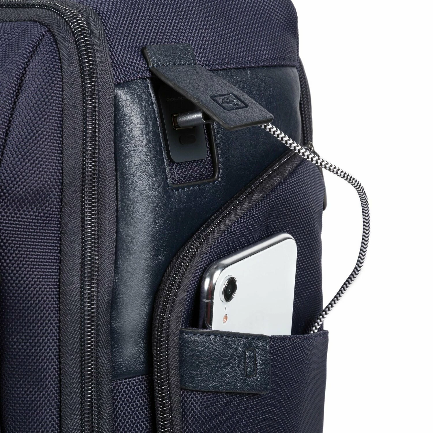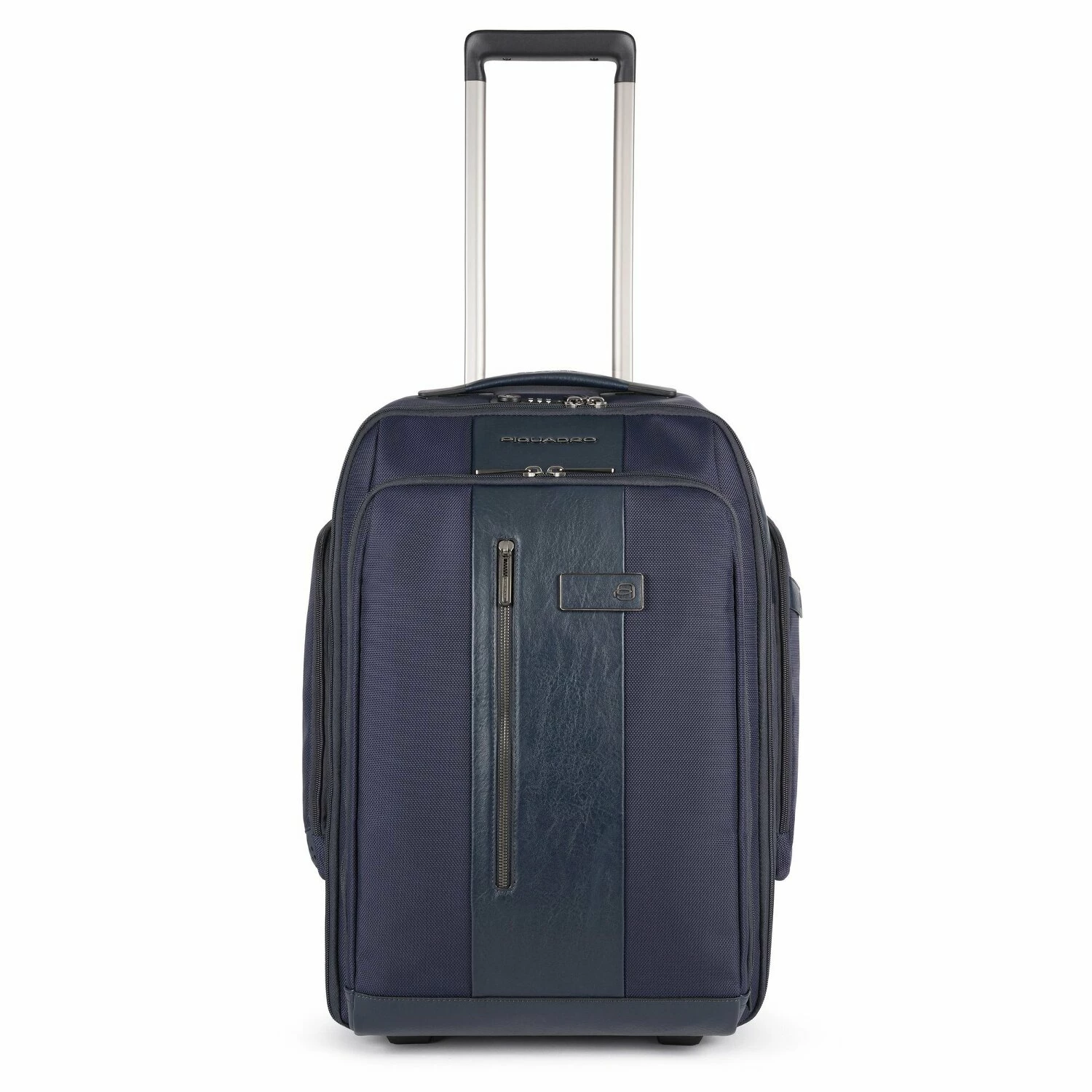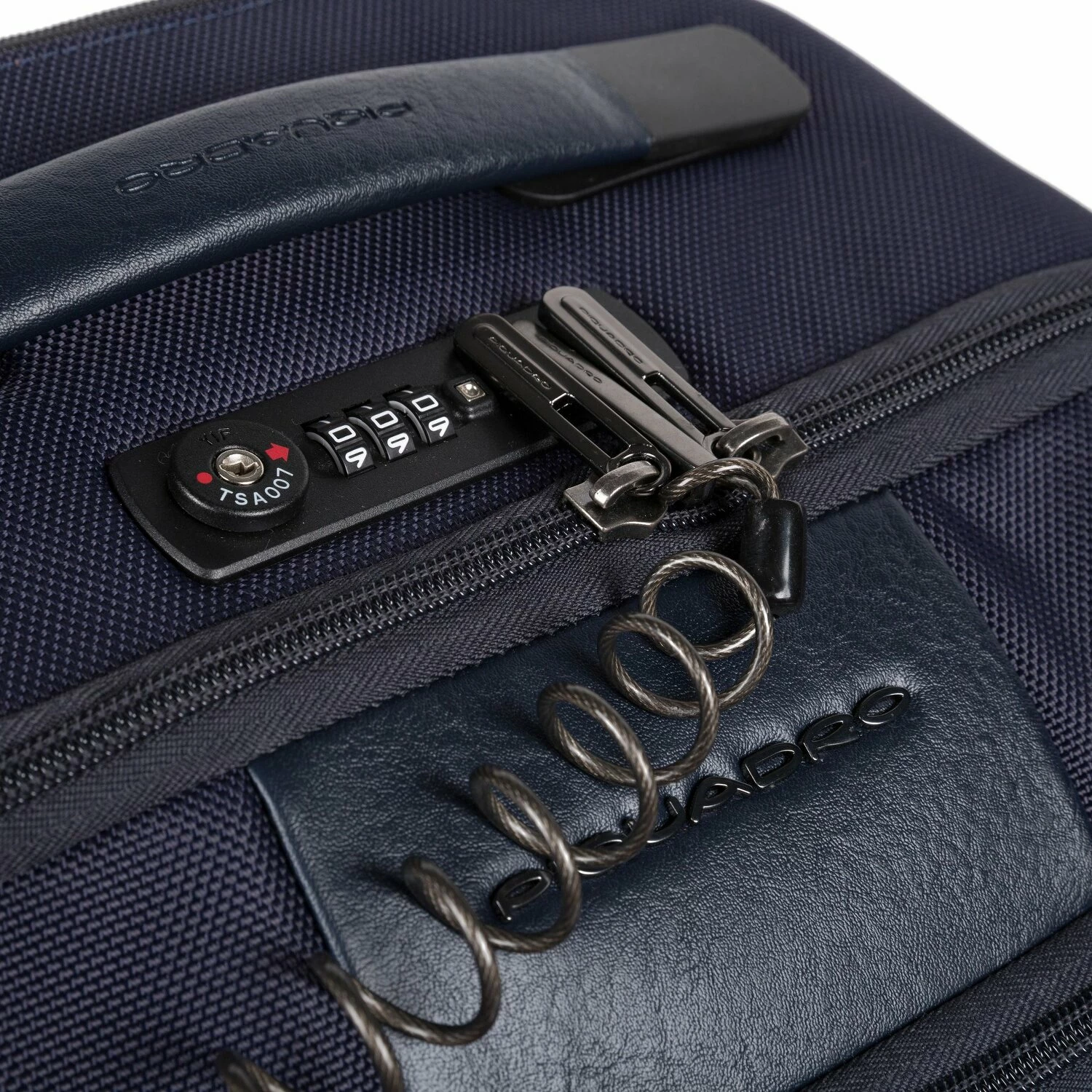 2-Rollen Businesstrolley von Piquadro der Brief Serie aus recyceltem, widerstandsfähigem Nylon mit Rucksackfunktion und arretierbarem Griff. Mit geräumigem Hauptfach bietet er genug Platz für eine Geschäftsreise und kann bei den meisten Fluggesellschaften als Handgepäck genutzt werden. Das Reißverschlussfach auf der Front ist mit einem gepolstertem Laptop- und Tabletfach ausgestattet. Im Hauptfach kann eine Powerbank angeschlossen werden, welche mit Kabeln mit dem Seitenfach verbunden ist, sodass Sie bequem ihre Geräte laden können. Das integrierte TSA-Schloss und Anti-Diebstahl Kabel bieten optimale Sicherheit.
