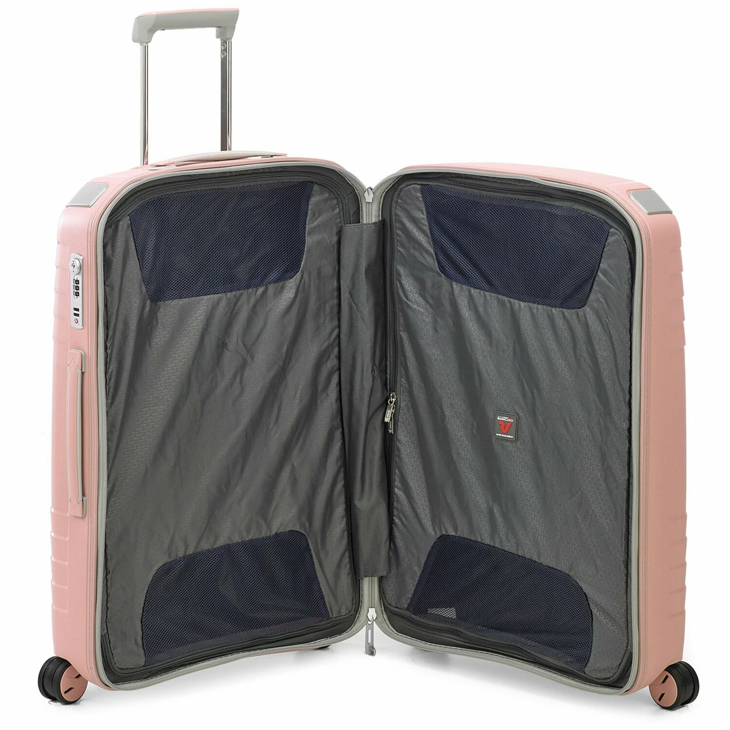 Stylischer Trolley von Roncato besteht aus recyceltem Polypropylen und ist somit stabil, robust und umweltfreundlich. Das Design des Koffers ist auffallend modern und macht ihn zum idealen Begleiter. Die hochwertige Verarbeitung erstreckt sich auch auf die geräuscharmen, 360 Grad schwenkbaren Rollen und den Teleskopgriff. Der Trolley ist zusätzlich mit Wäschefach sowie Reißverschlussfächern ausgestattet und verfügt über eine tolle Raumteilung.