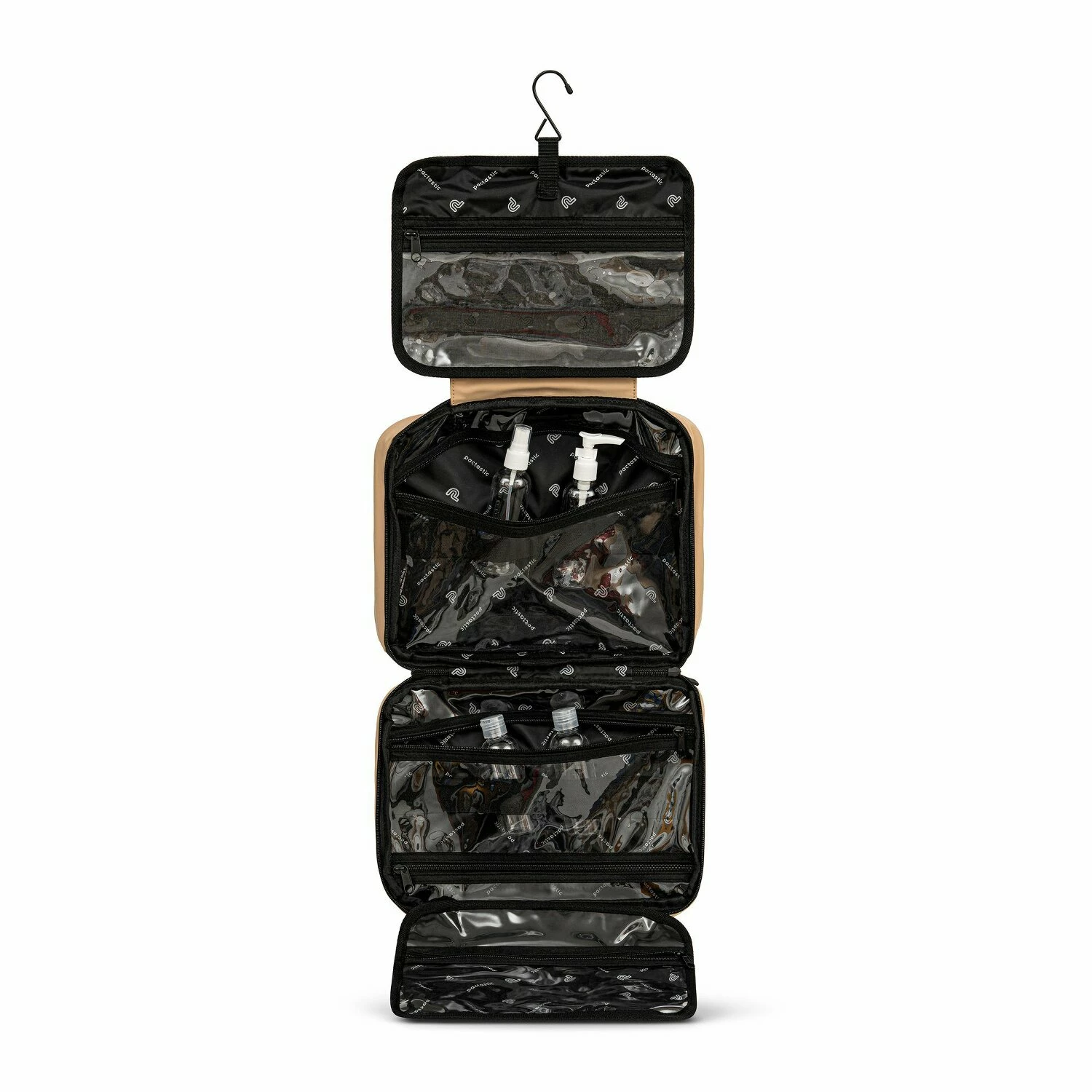 Sportlicher Kulturbeutel von pactastic mit vielen transparenten Reißverschlussfächern im Inneren. Dank Haken lässt sich der Kulturbeutel auch aufhängen.